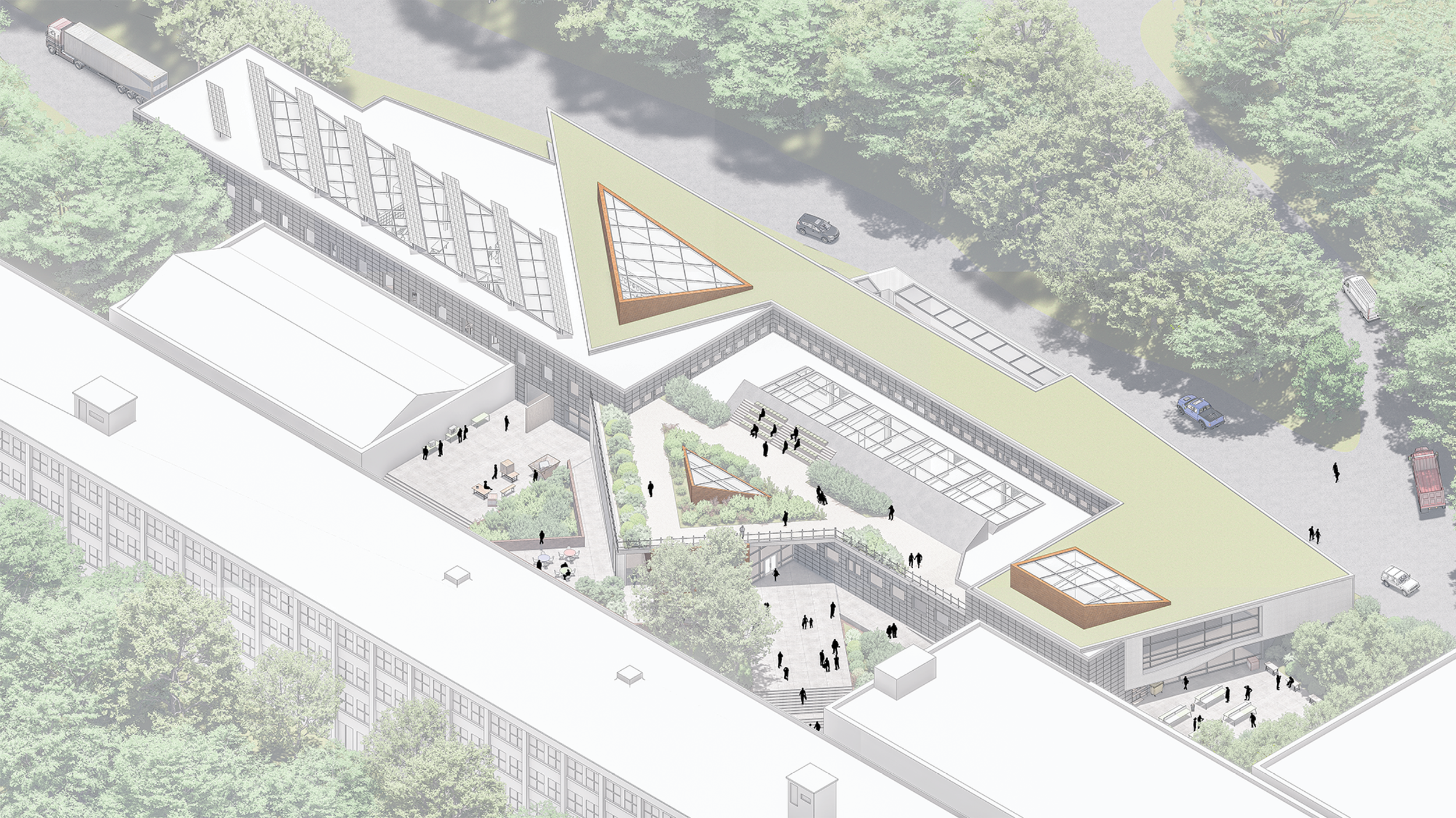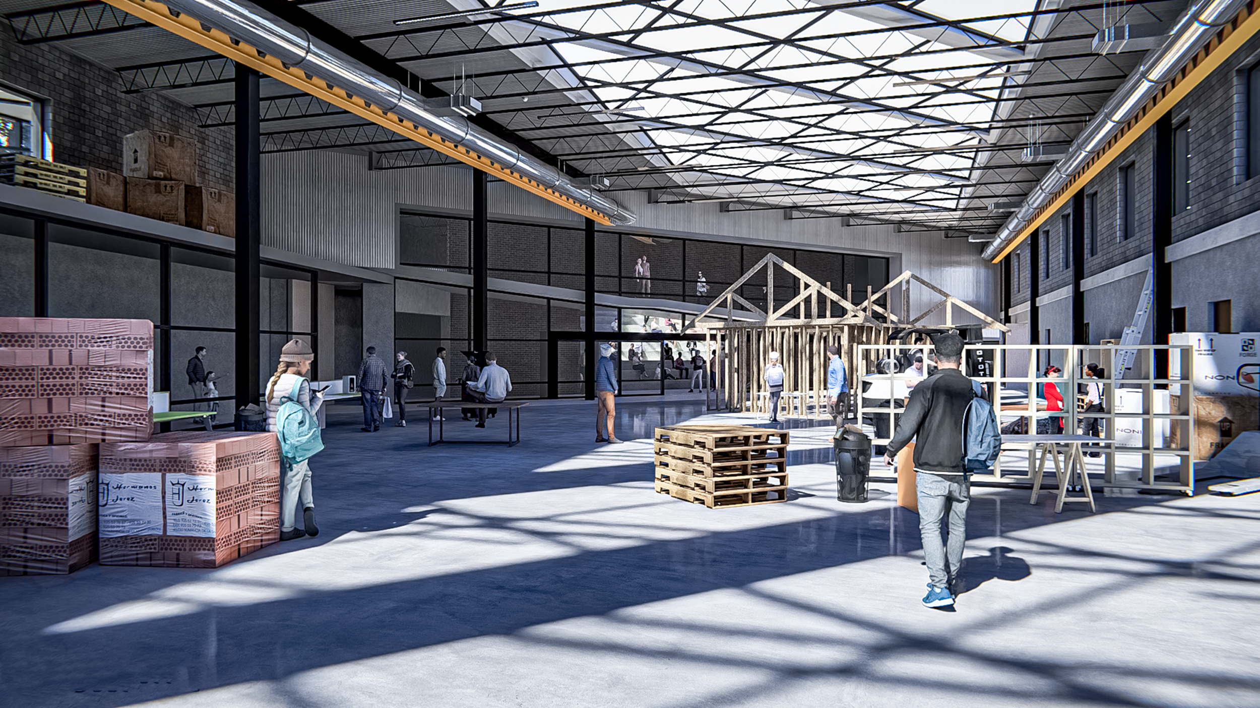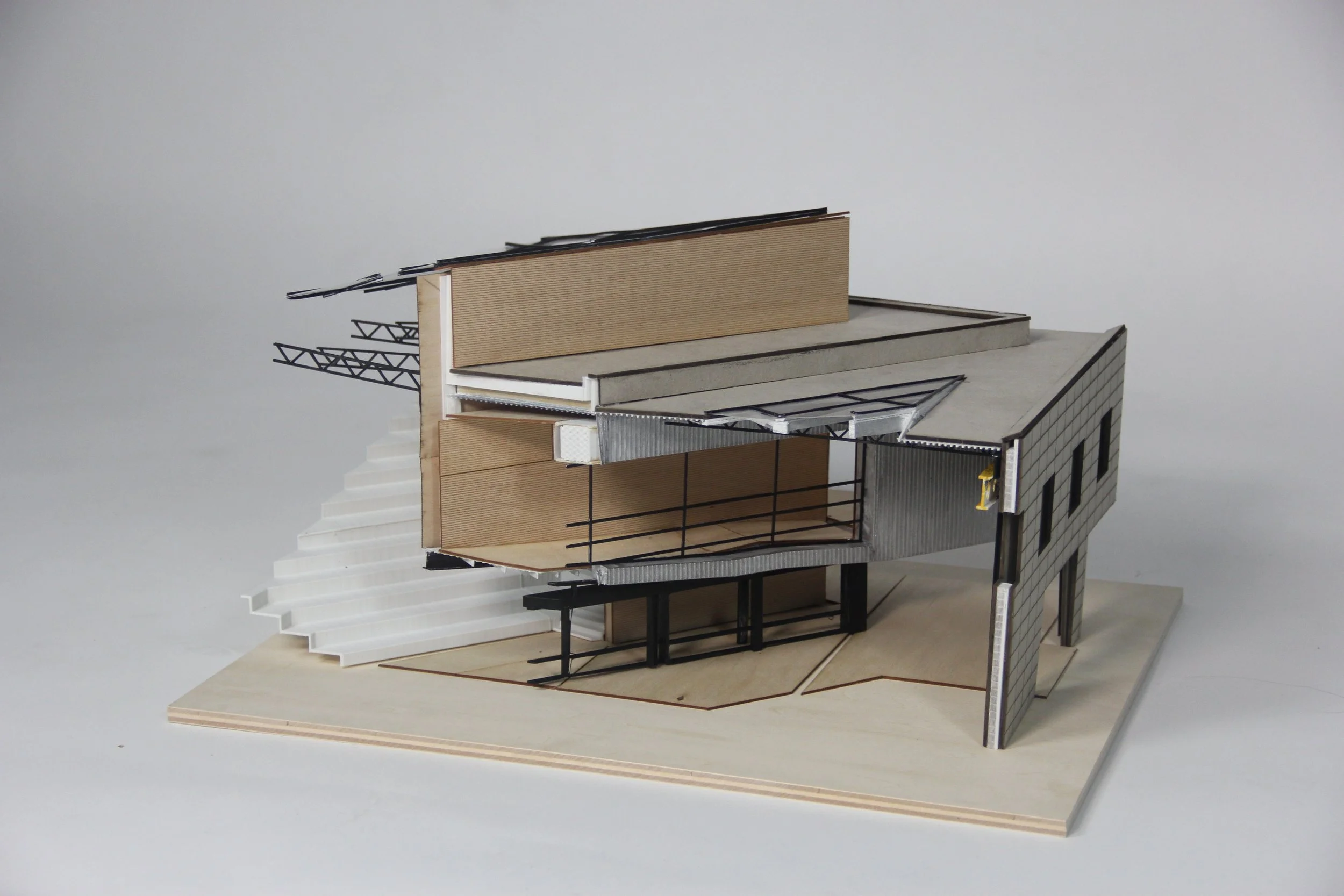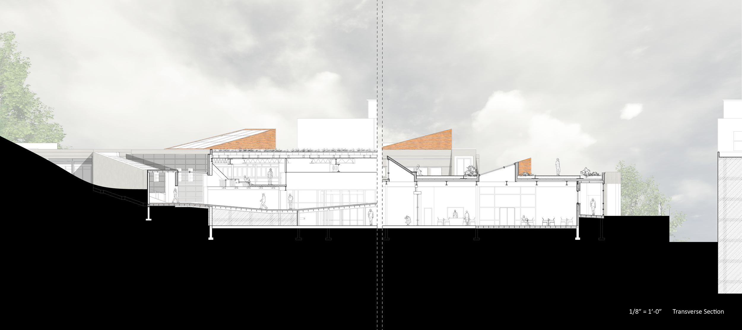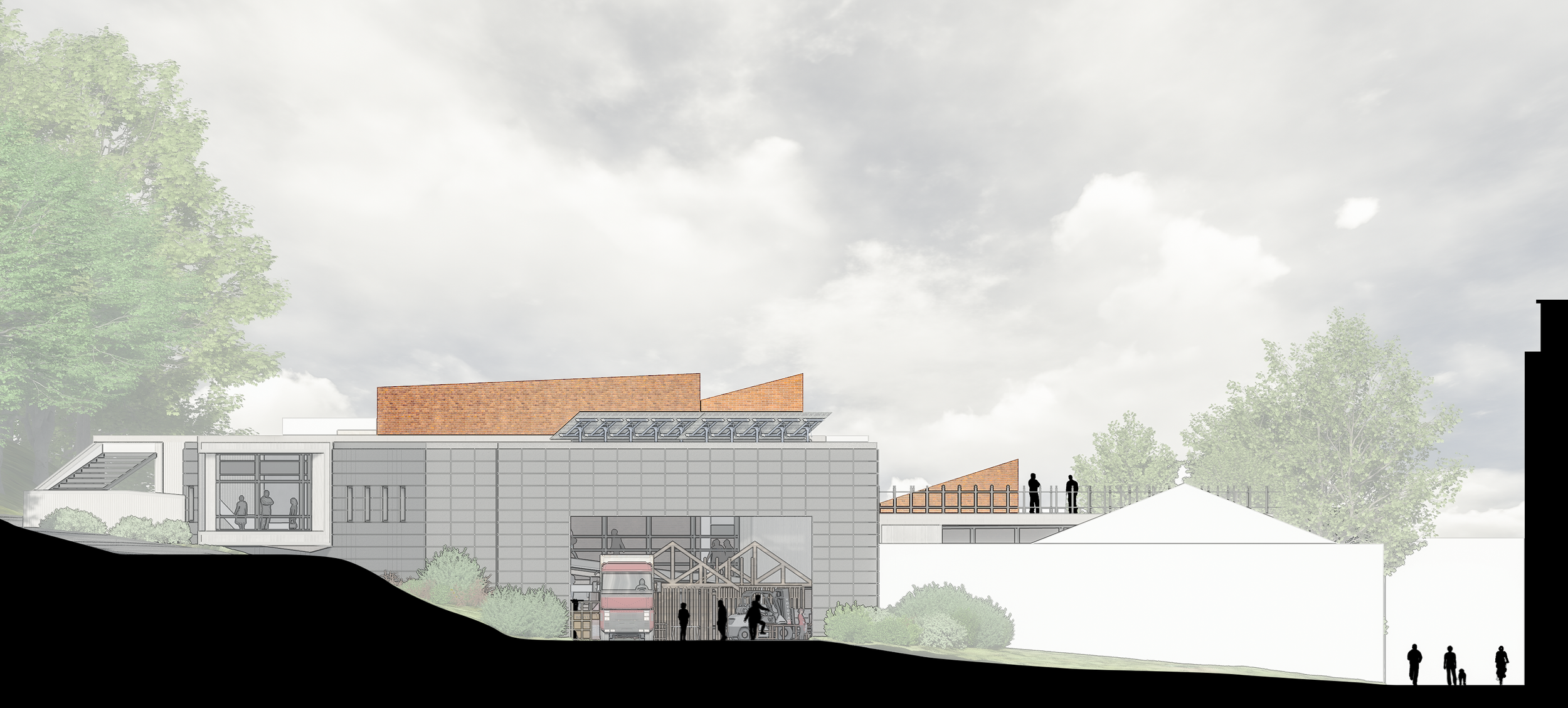 Staple of Ithaca is an adaptive reuse project using the existing buildings of 13 and part of 14 of the old Morse Chain Factory to create a workforce development center for the residents of Tompkins County. The project approached the brief with three problems in mind. The first of which is to educate by creating a space where the existing workforce and new trainees alike can learn the necessary skills to keep Ithaca on track for its 2030 goals. The second was to increase public exposure to the targeted workforce as there is a need for people in the area to learn construction so that the area can produce more residences. The third and final goal of the project was to provide a method of circulation from the upper part of South Hill to the lower part for an easier way to get foot traffic to town center.