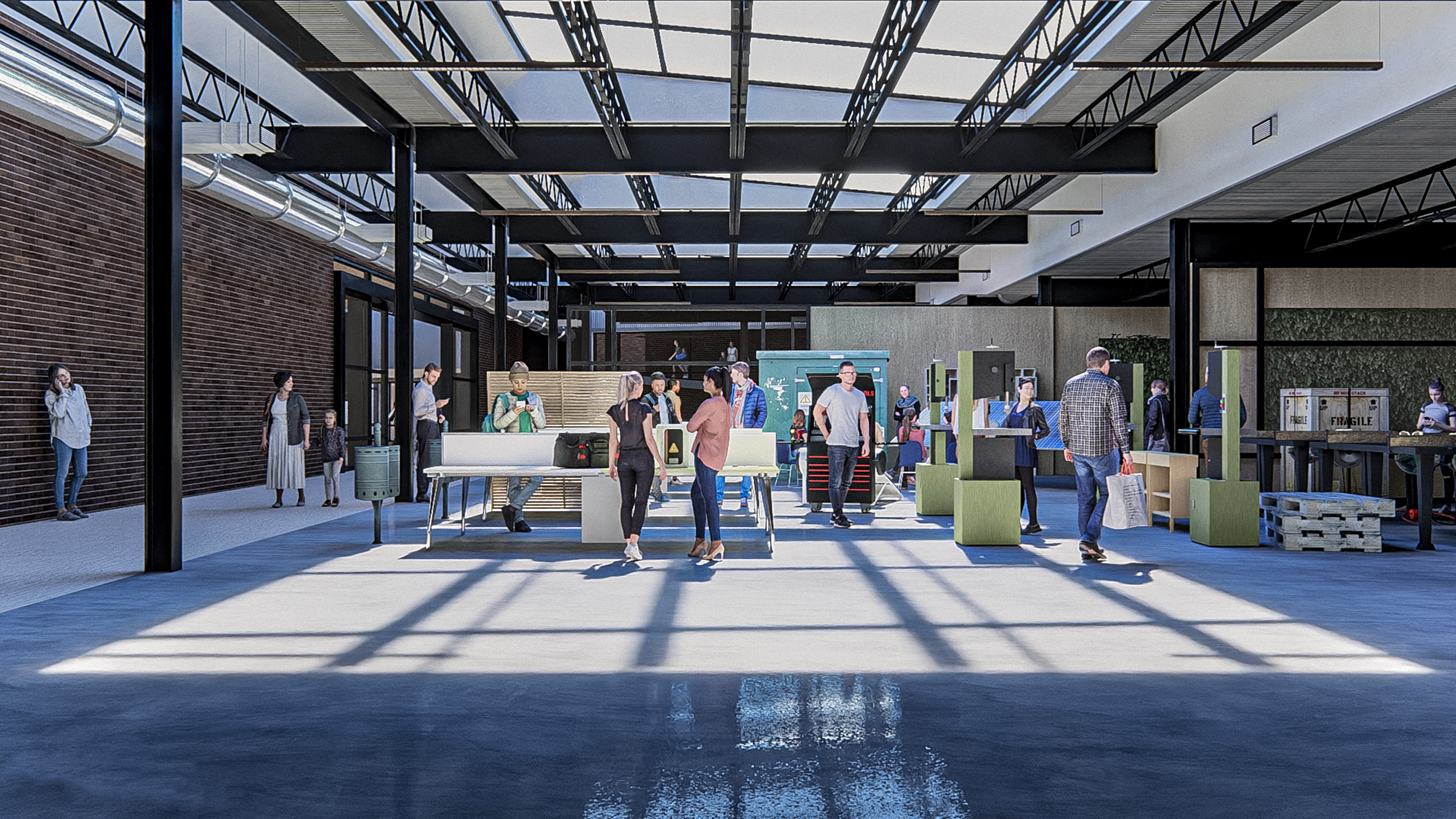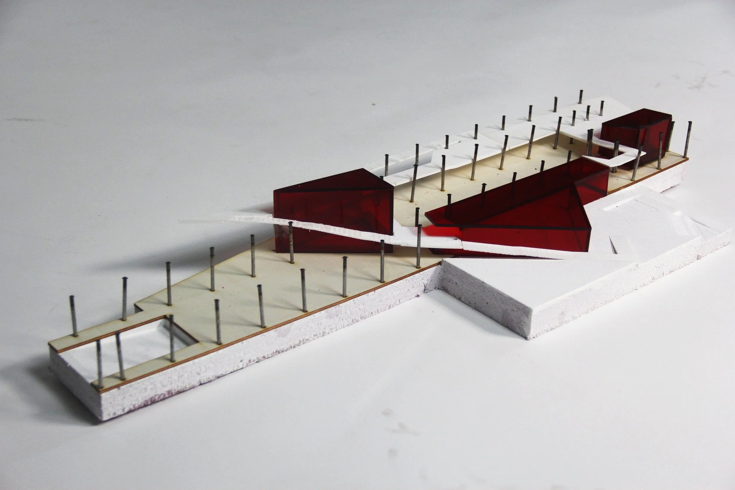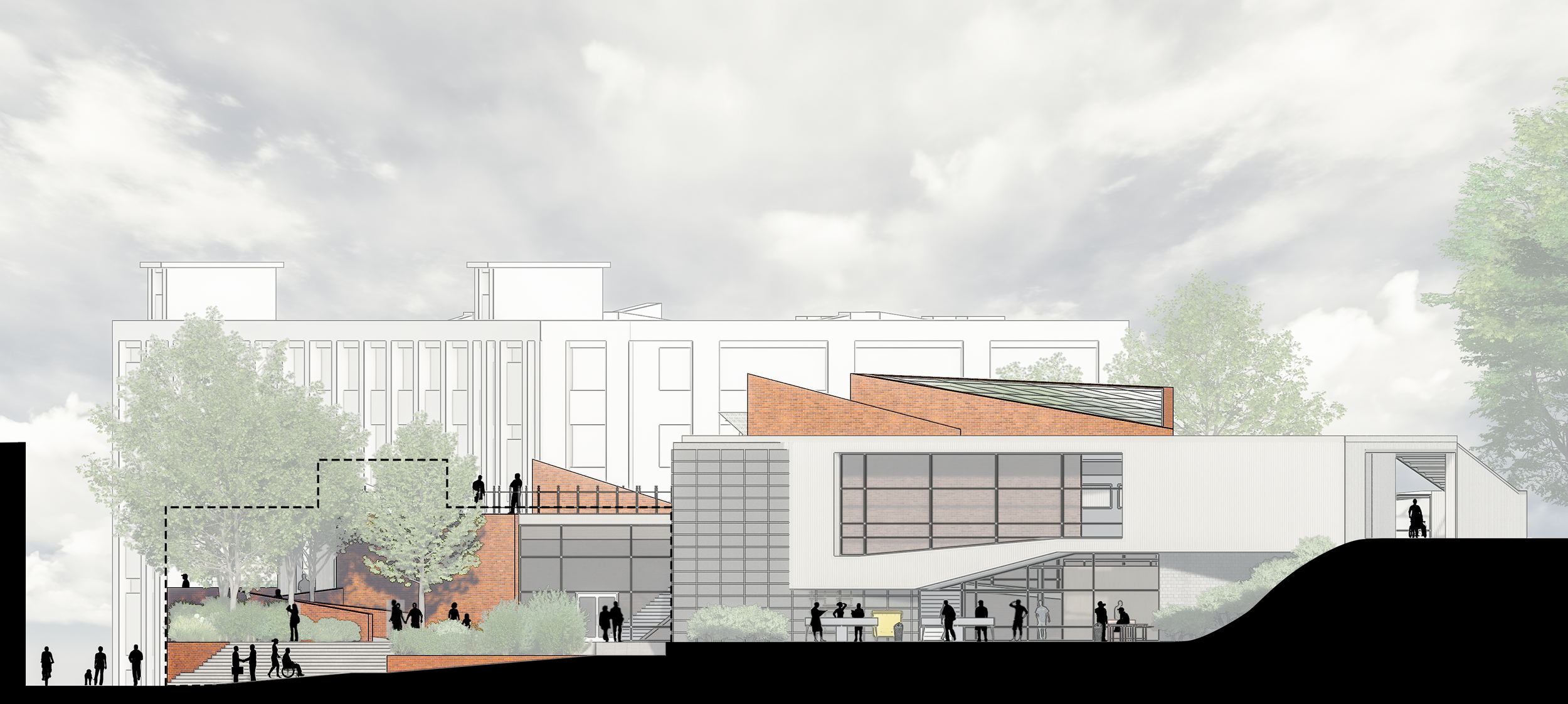 The project sees itself as a staple within its own walls and amongst its topography tying things together as it is used. This happens on a personal, building, and site level. The project inserts a mass which serves as a public corridor amongst the already existing mass dedicated to workforce development functions that allow for the public to get visual exposure to these functions. Then, these two masses are tied together in the places bordered by brick to allow them to stand out. The project preserves almost all existing structure and reuses many of the materials that were already on site such as the corrugated steel decking on the roof which was moved to the siding.