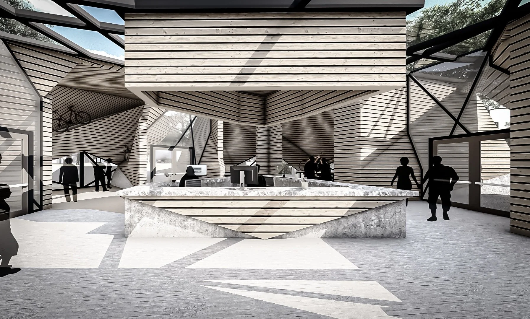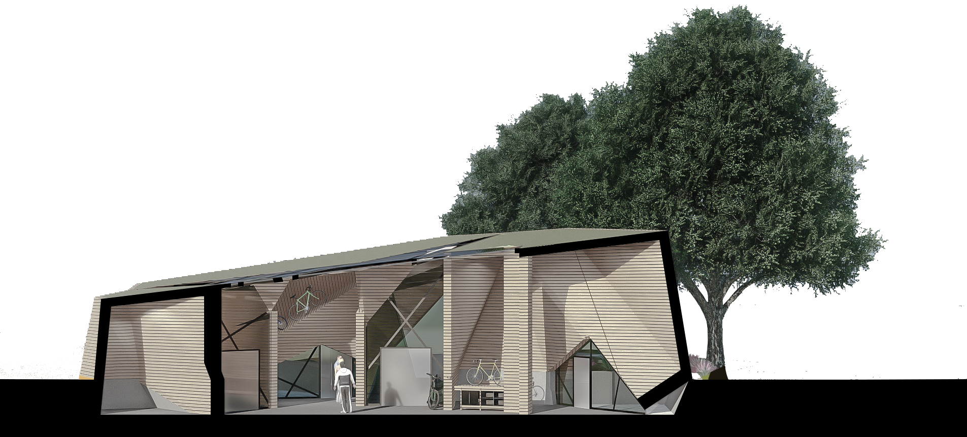 The Three Sisters Bike Shop was designed with transition in mind. It seeks to not only allow for optimum functionality as a bike shop, but also to become a motivator toward the usage of bikes as a main mode of transportation for the residents of Pittsburgh. With its site being located in such a way that on the northern side is a residential area adjacent to a busy road, and on its south side, the natural preserve of Frick Park, it truly allows the site to become a threshold between the built and natural environment. That is exactly what the bike shop accomplishes.